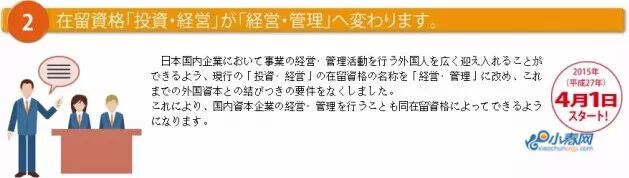由于目前的行政手续过于复杂,过于严格,为了吸引更多的外国经营管理人才来日,2015年4月起,根据《入管法改正案》,曾经的「投资经营」签证改名为「经营管理」签证。同时,政府将在3月重新修改外国人在日本国内开设公司的相关规则。